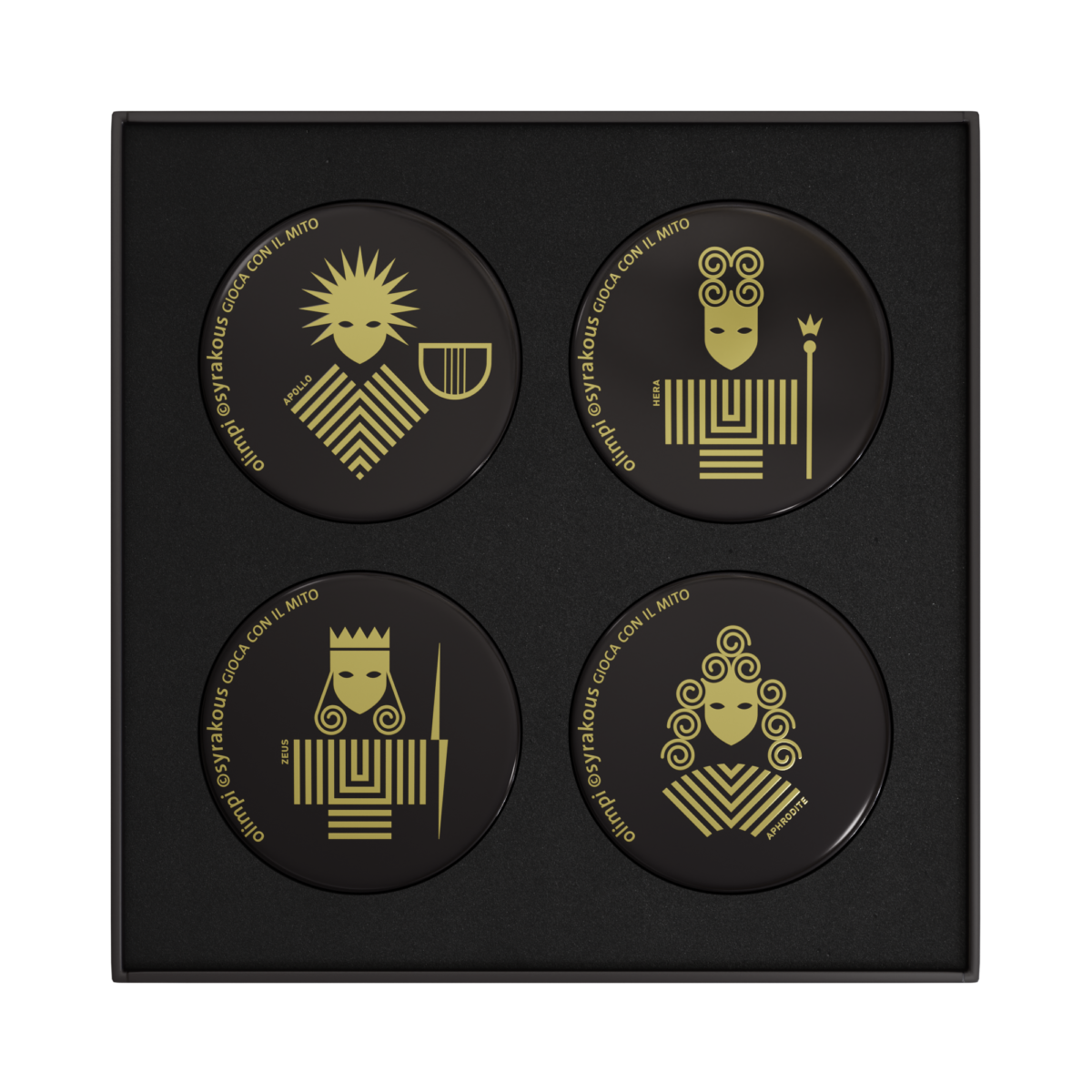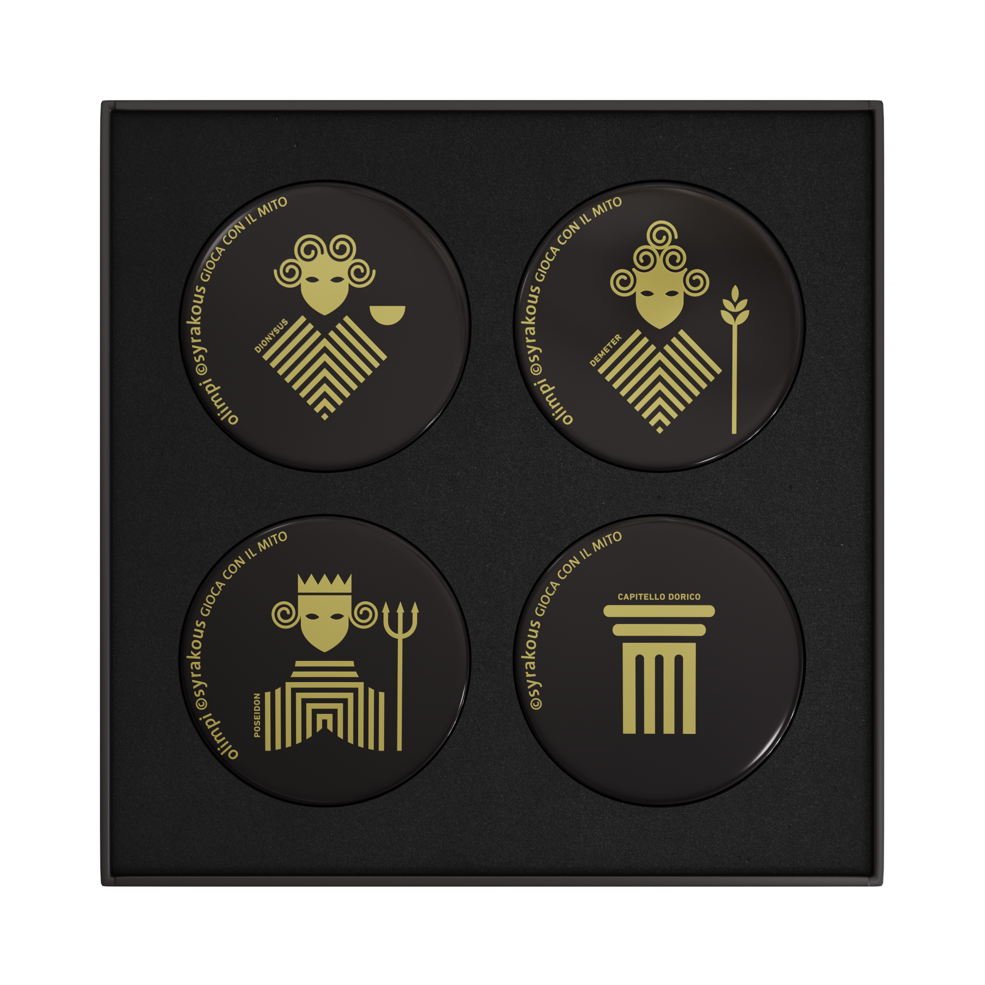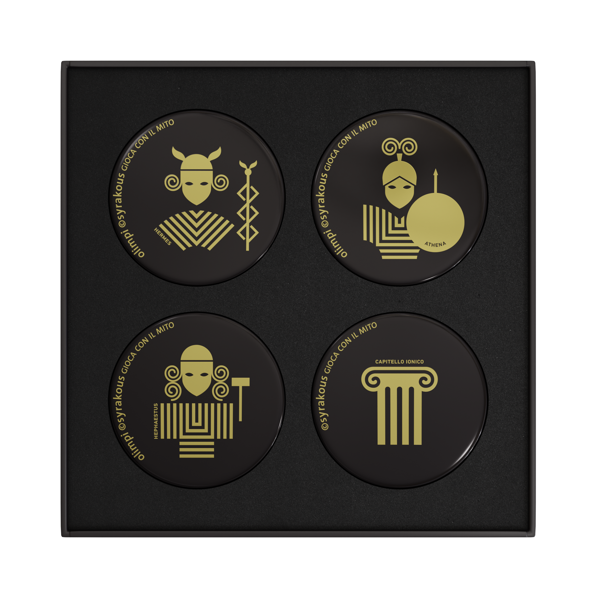 L’espositore 160 Mitomagneti Syrakous è una soluzione pronta per l’esposizione, ideale per bookshop, musei e rivenditori specializzati che cercano un souvenir di design. La scatola espositore è realizzata in cartone e rifinita con una raffinata stampa in oro lucido, pensata per rendere la collezione protagonista sul banco o a scaffale. All’interno sono presenti 160 calamite decorative della serie picche, dedicate ad Ares, Artemide, Ade e al capitello corinzio. Le figure dorate su fondo nero fondono estetica e mito in chiave contemporanea, trasformando un oggetto quotidiano in un frammento di identità culturale. Adatto anche a contesti educativi e culturali.